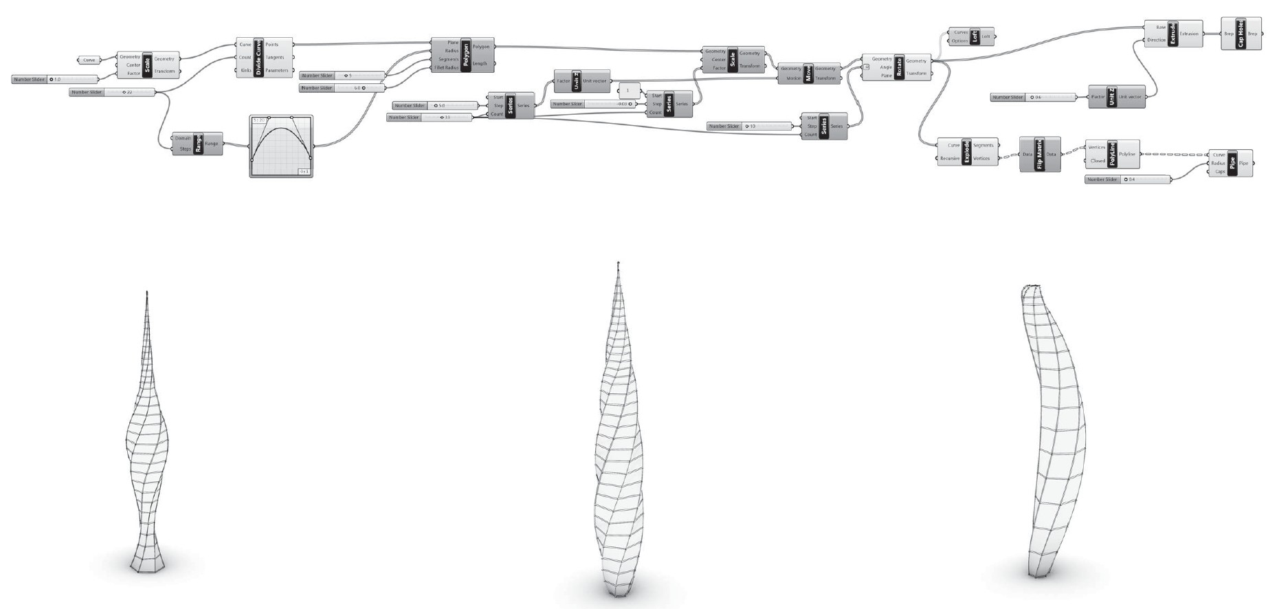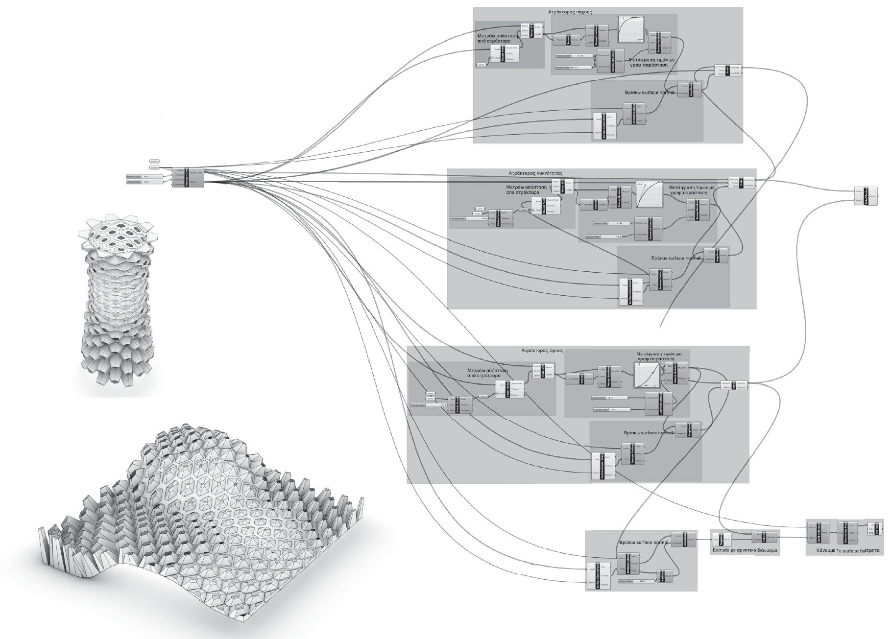 The first part of the studio was an introduction to Rhino and Grasshopper through a series of exercises. In these exercises, we created parametric models, some of them with parametric characteristics. The biomimetic approach was necessary for the main part of the following studio.
