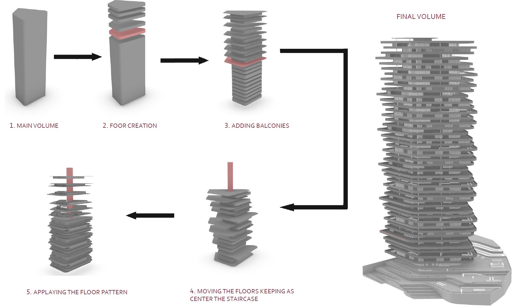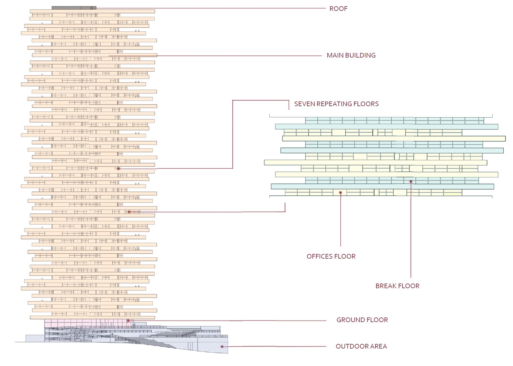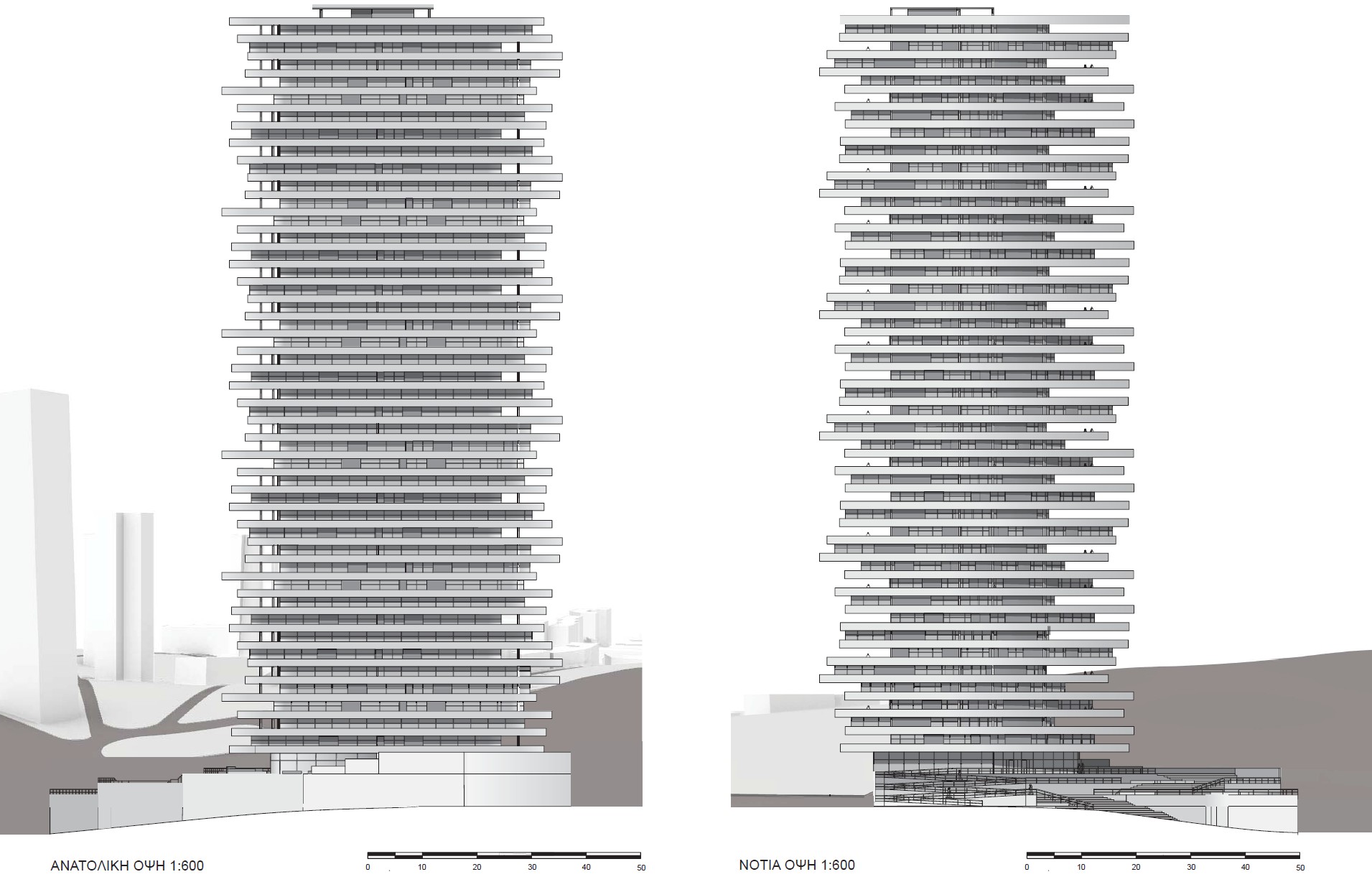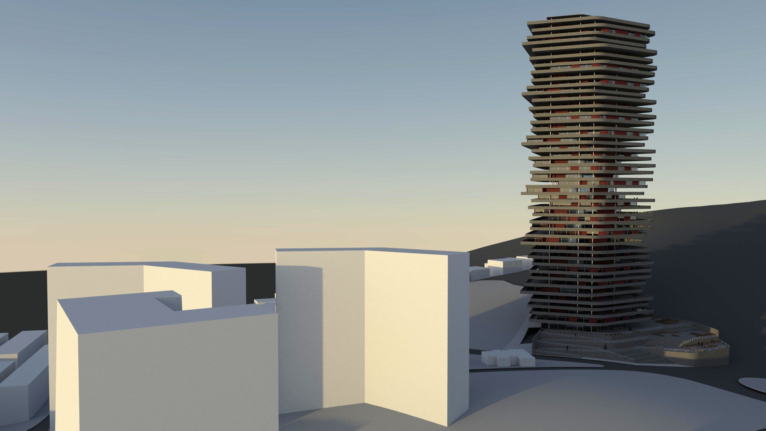 Inspired by nature in both form and function, this biomimetic project is based on the geometries of shale rocks. By observing the birds that nest on shale cliffs, we study the potential benefits of an architecture characterized by the contractions and protrusions formed due to an asymmetrical layering of similar masses. As a result, we take advantage of this morphology’s natural functionality to shield from the sun and wind. Specifically, this is a forty-two-story building that houses a variant of offices, study halls, indoor parks, and outdoor balconies, which despite its size could be categorized as a low energy consumption building design due to its energy efficient shape that both shades from the sun (and so it minimizes the use of air-conditioning) and protects from the wind (and so being able to ventilate naturally, through windows, despite the strong winds that are expected in high-rise buildings).